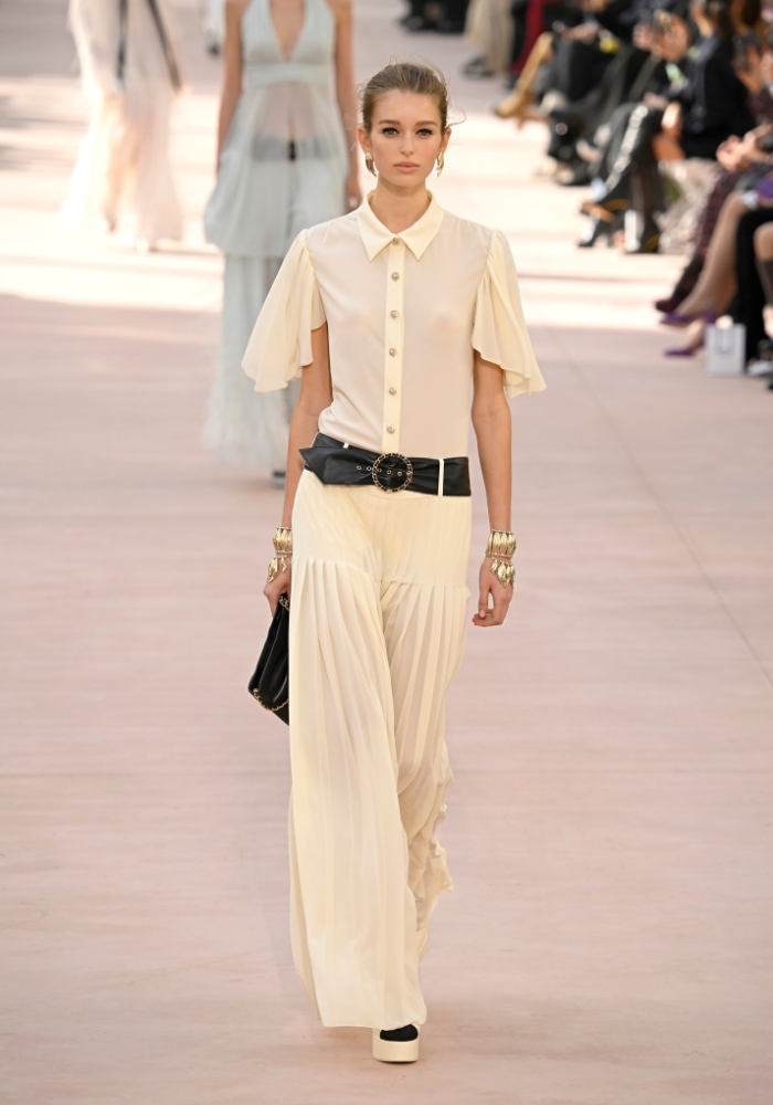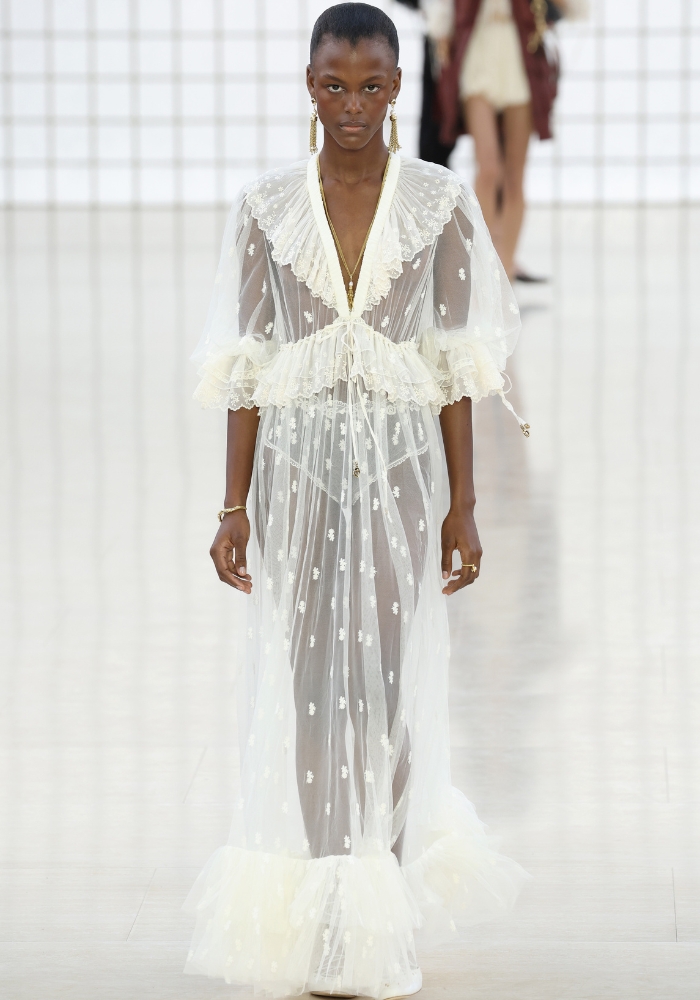 Det er sexy og kult. En av de mest dominerende trendene på catwalkene under alle moteukene var transparens. Designere som Nensi Dojaka, Fendi, Chanel, Victoria Beckham og Hermès viste at det kan være både elegant og sofistikert å ha gjennomsiktige klær – uten at man nødvendigvis avslører for mye. Hermès leverte en av de mest elegante transparente lookene: en tynn, gjennomsiktig topp med matchende bukser og et brunt skinnbelte høyt i livet. Hold utkikk etter chiffon og tynne tylldetaljer, og jobb gjerne med lag-på-lag-stil – eller skap kontraster med denim eller strikk.