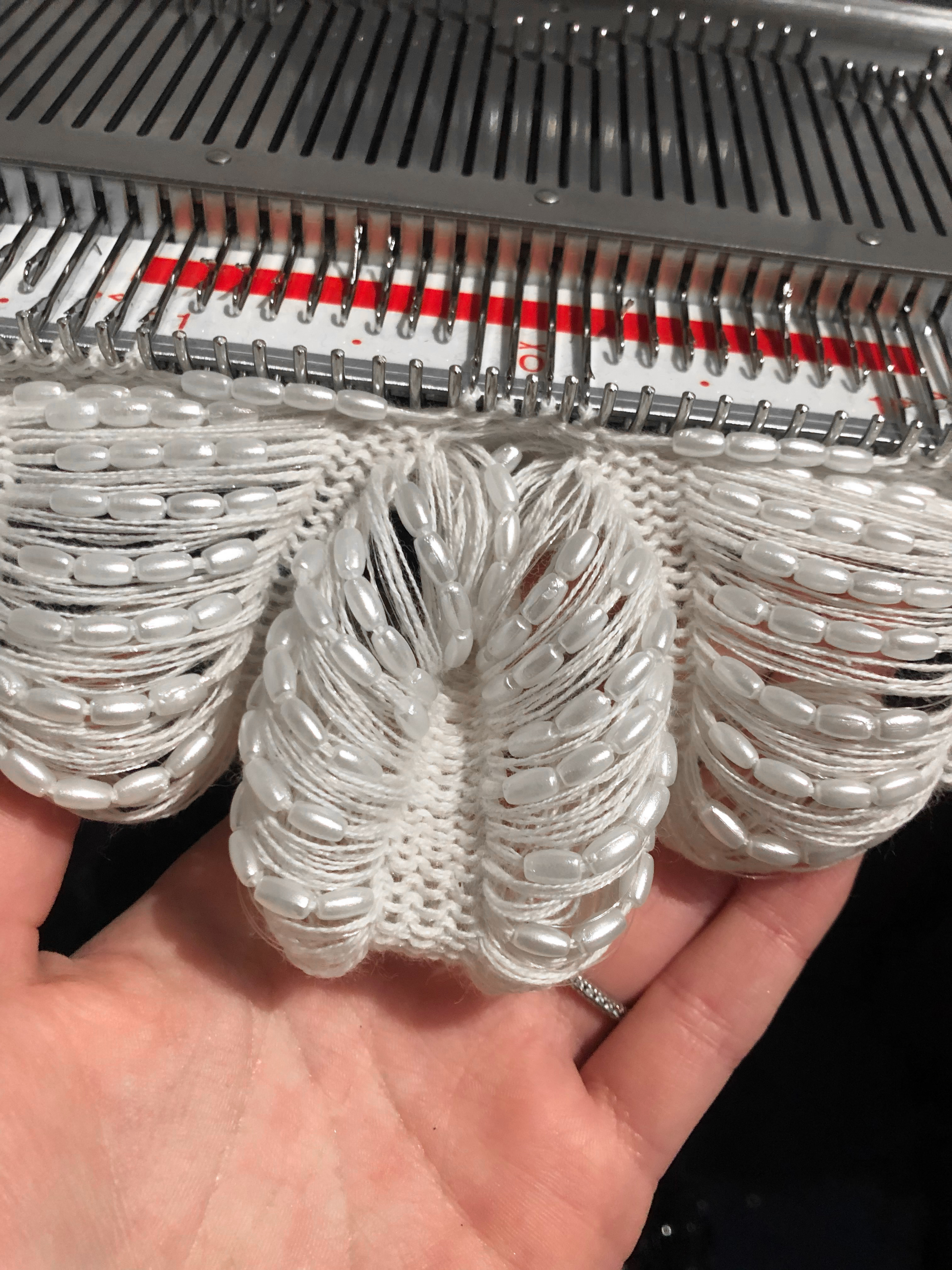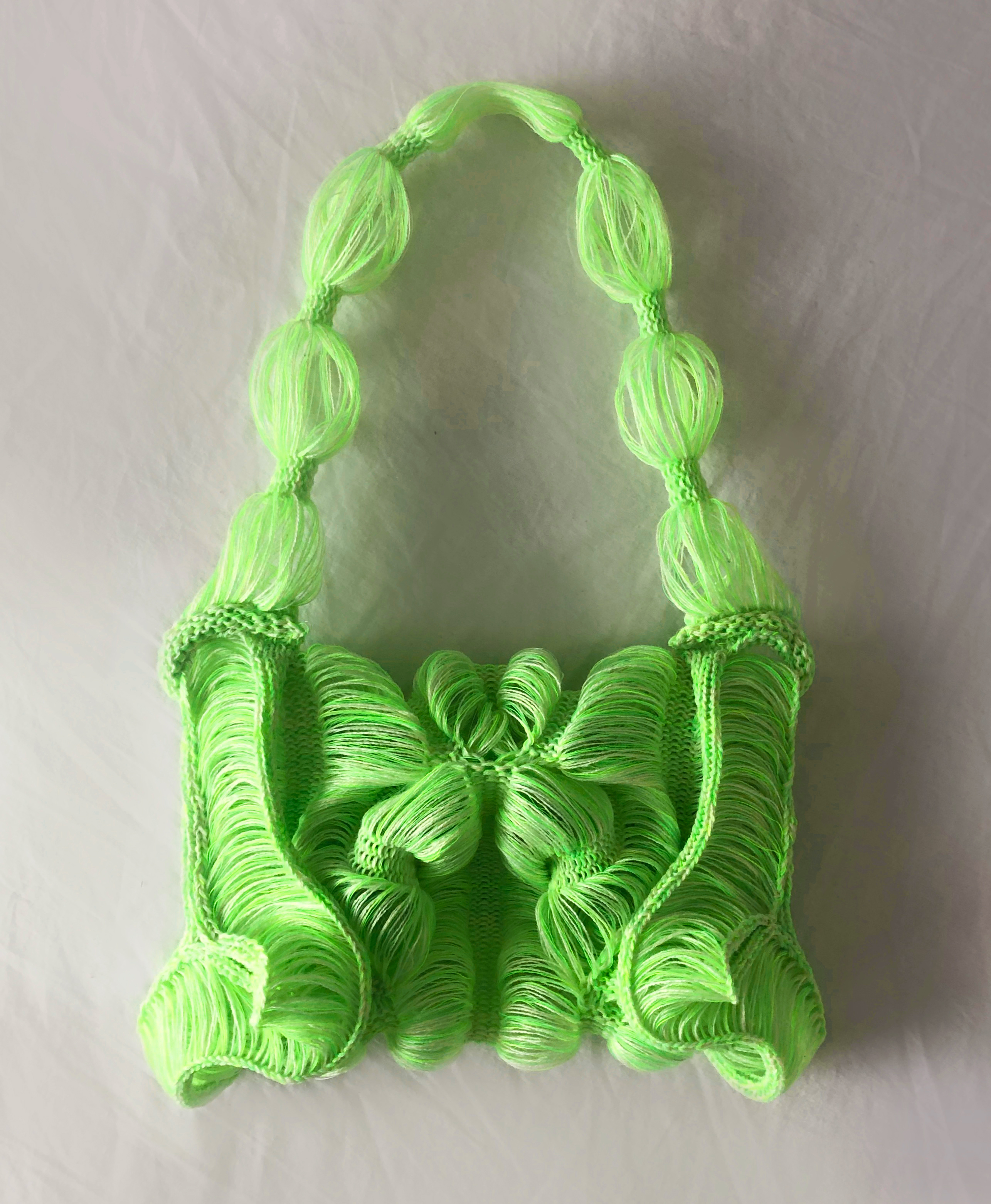 ”Jeg har valgt at kalde kollektion for “In Bloom”, fordi det reflekterer min arbejdsproces, hvor en enkelt garntråd kommer ud af strikkemaskinen og nærmest blomstrer, som en blomst der begynder som en knop og derefter eksploderer i farver og lag.”