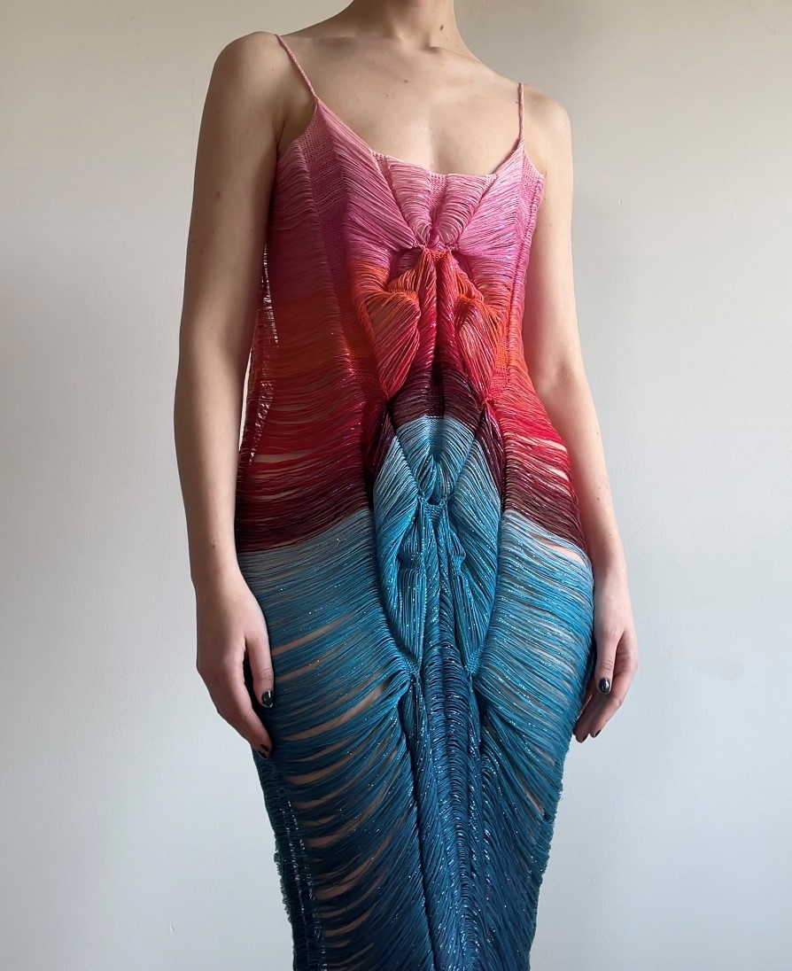 "Det første og fremmeste aspekt er, at alt mit arbejde er zero-waste. Strik er en fantastisk måde at undgå spild på, da jeg kun bruger det materiale, der er behov for, og der derfor ikke er overskydende stof i forbindelse med tilskæring. Jeg bruger også dette princip, når jeg laver prøver eller teststrik. Hvis jeg ikke gemmer en prøve til reference, trevler jeg den op, så jeg kan bruge garnet igen. På den måde er der endnu mindre spild, og det gør også, at jeg sparer mange penge, og at alle materialer bliver brugt og ikke smidt i skraldespanden."